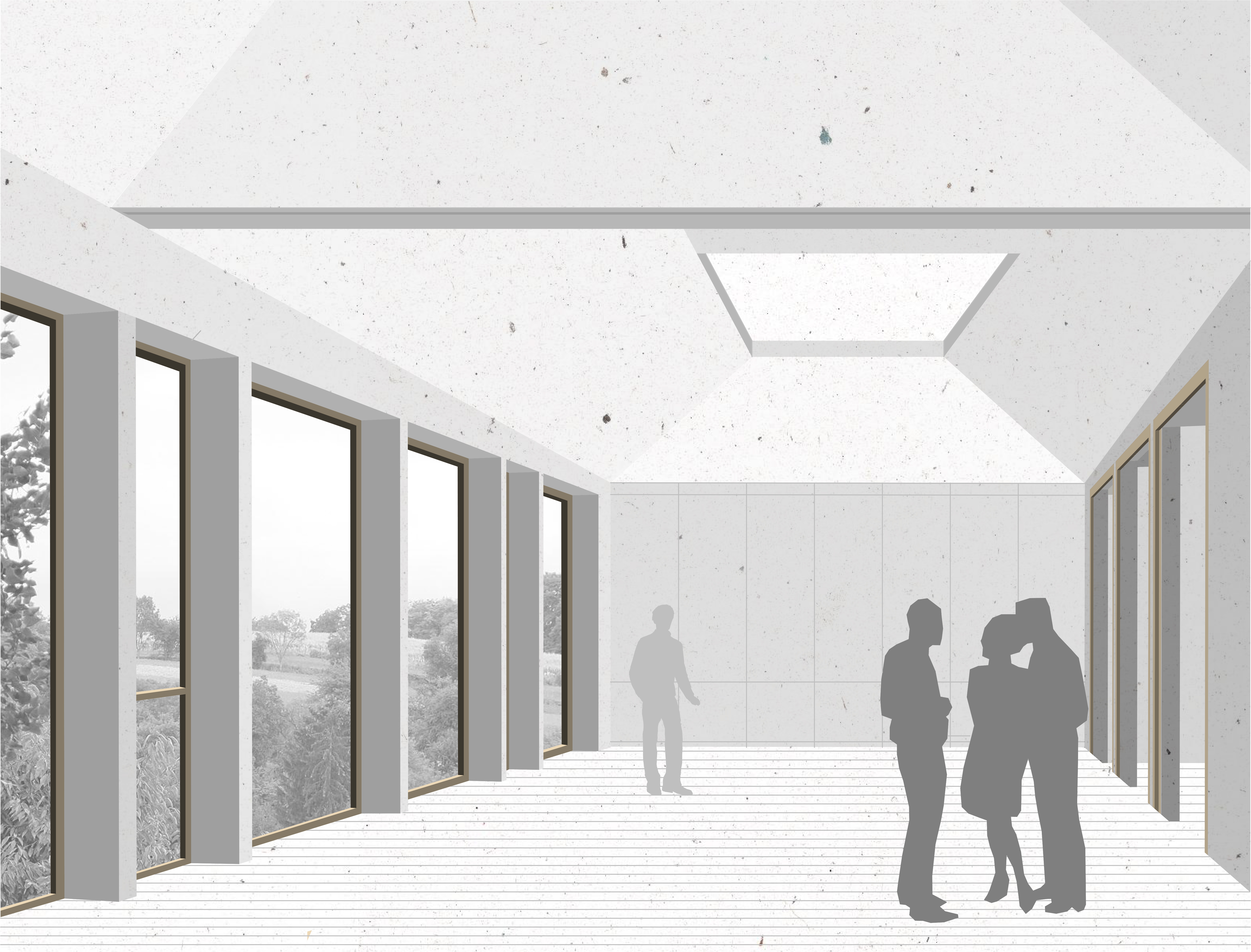 Für regelmäßig stattfindende Nutzungen können die Räume durch ausfahrbare Wände getrennt voneinander genutzt werden. Besonderes Augenmerk liegt auf der Beziehung zwischen Innen- und Außenraum. Aus- und Durchblicke entstehen durch die bodentiefe Fensterfront im Norden und dem nahezu vollständig zu öffnenden Foyerbereich.