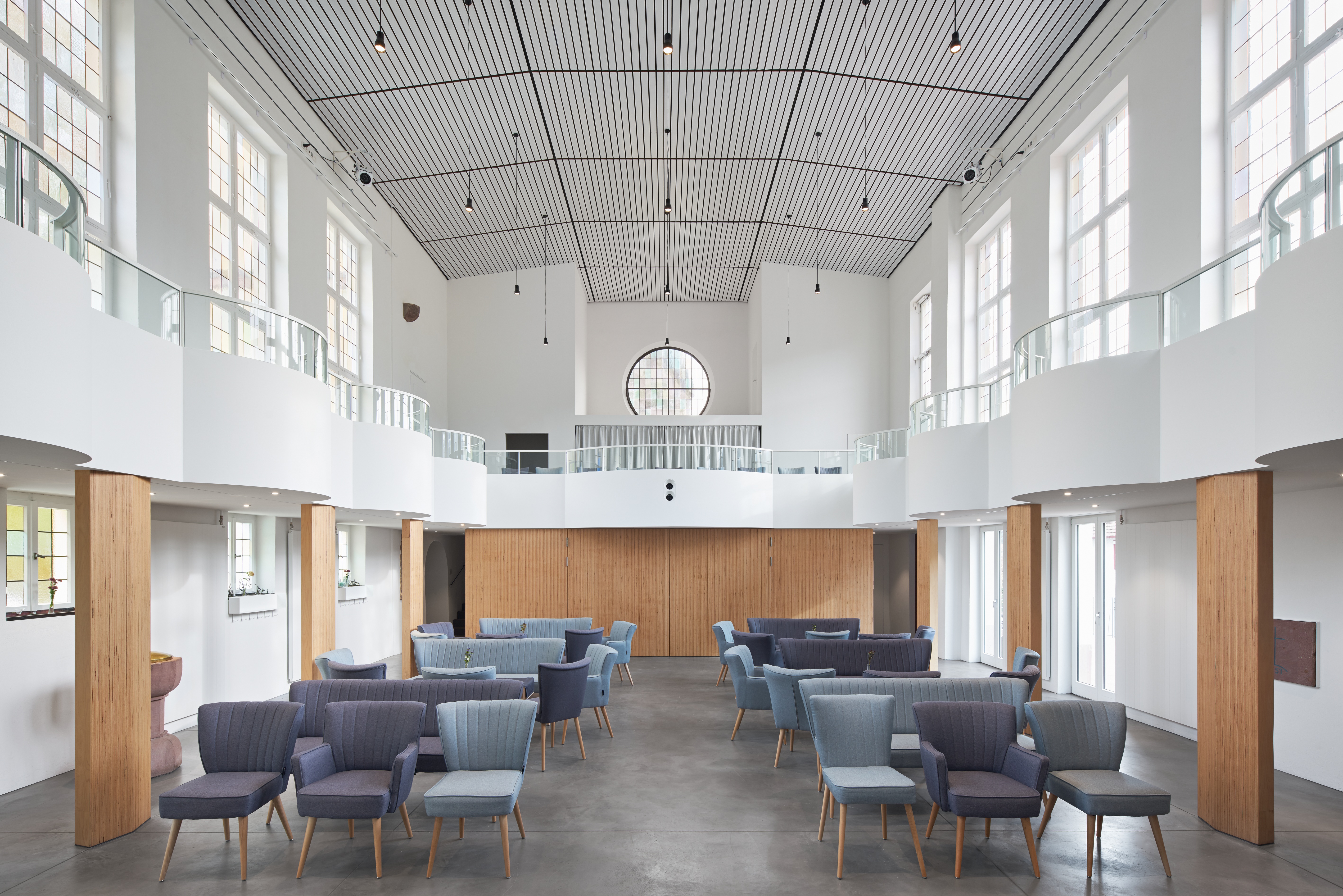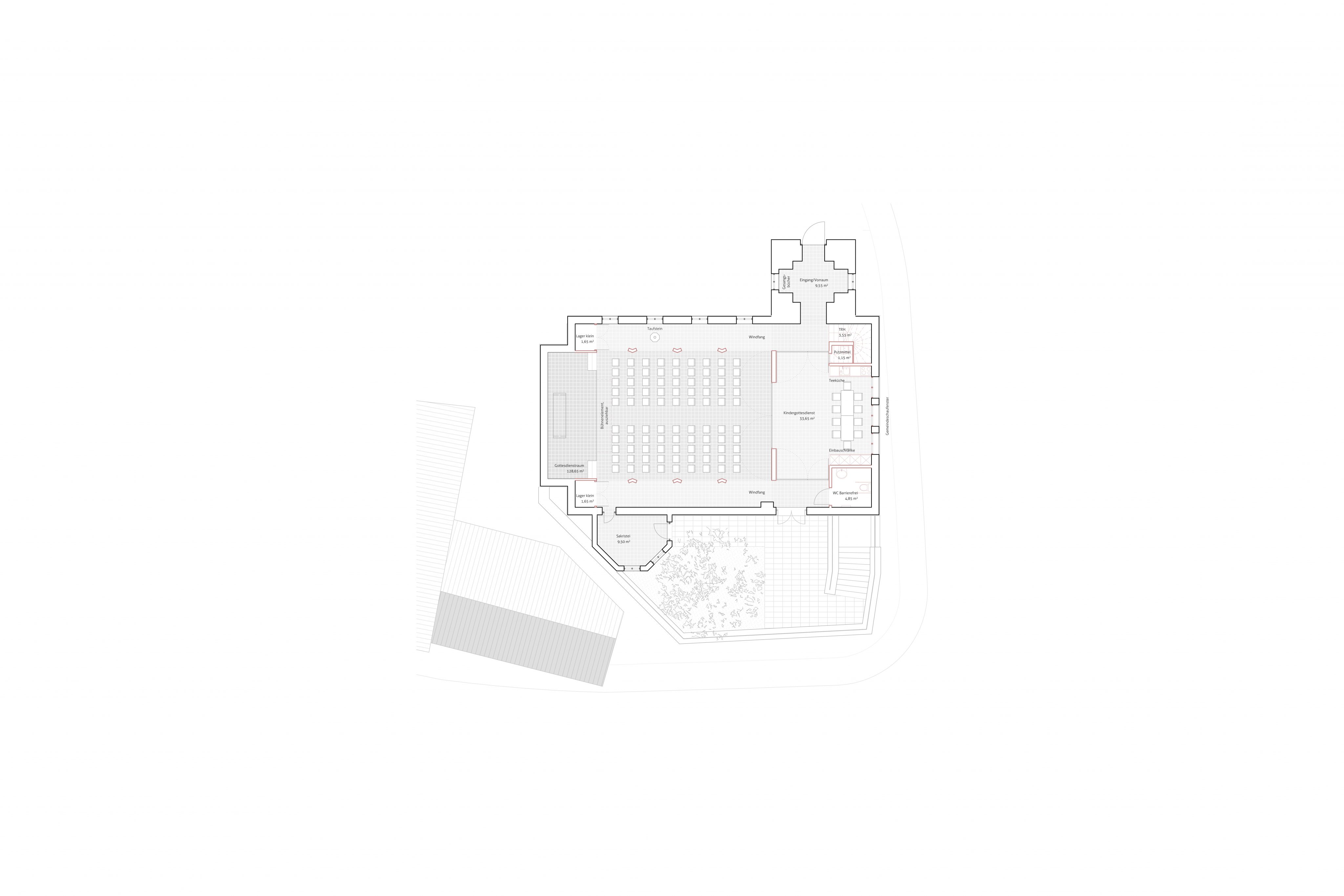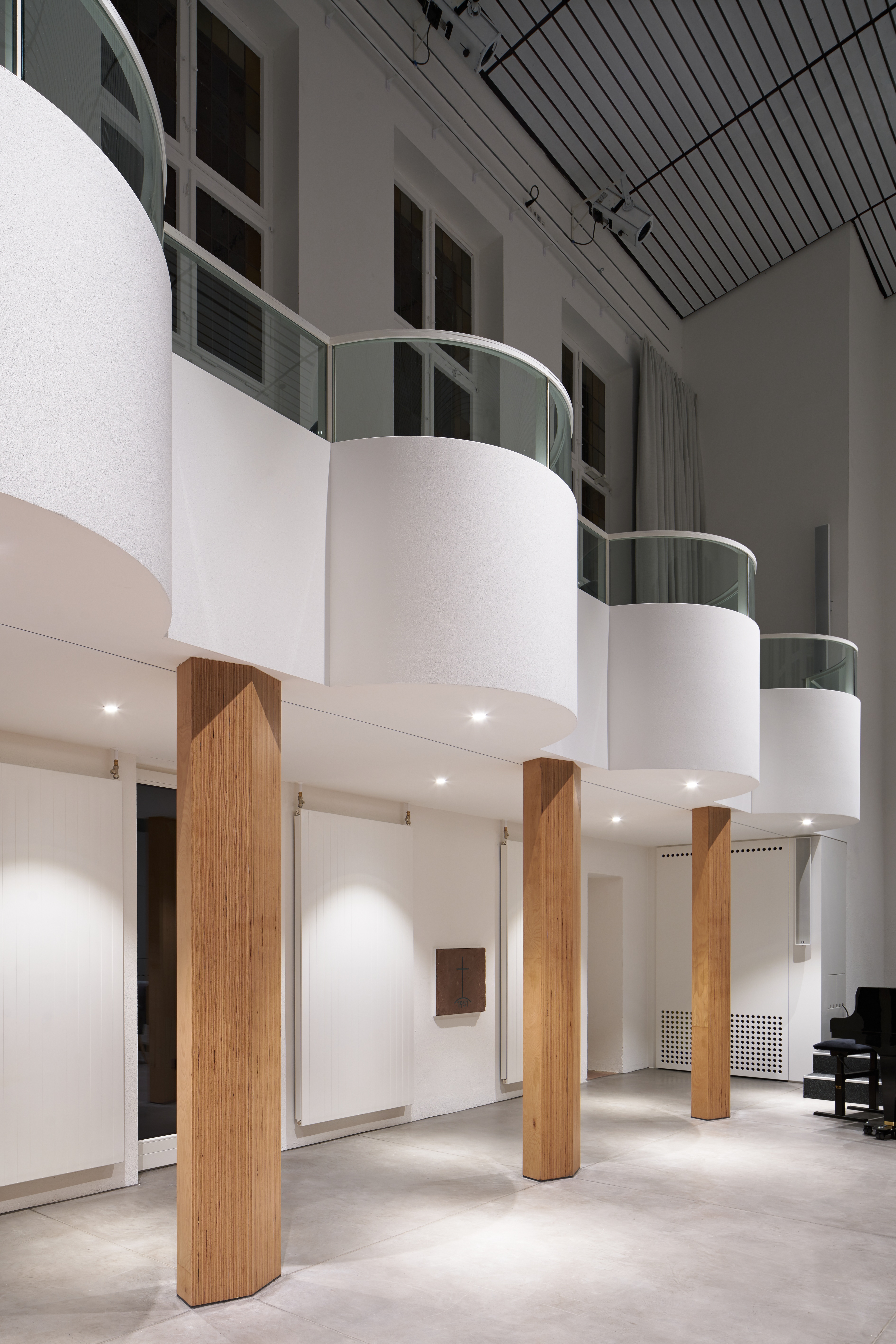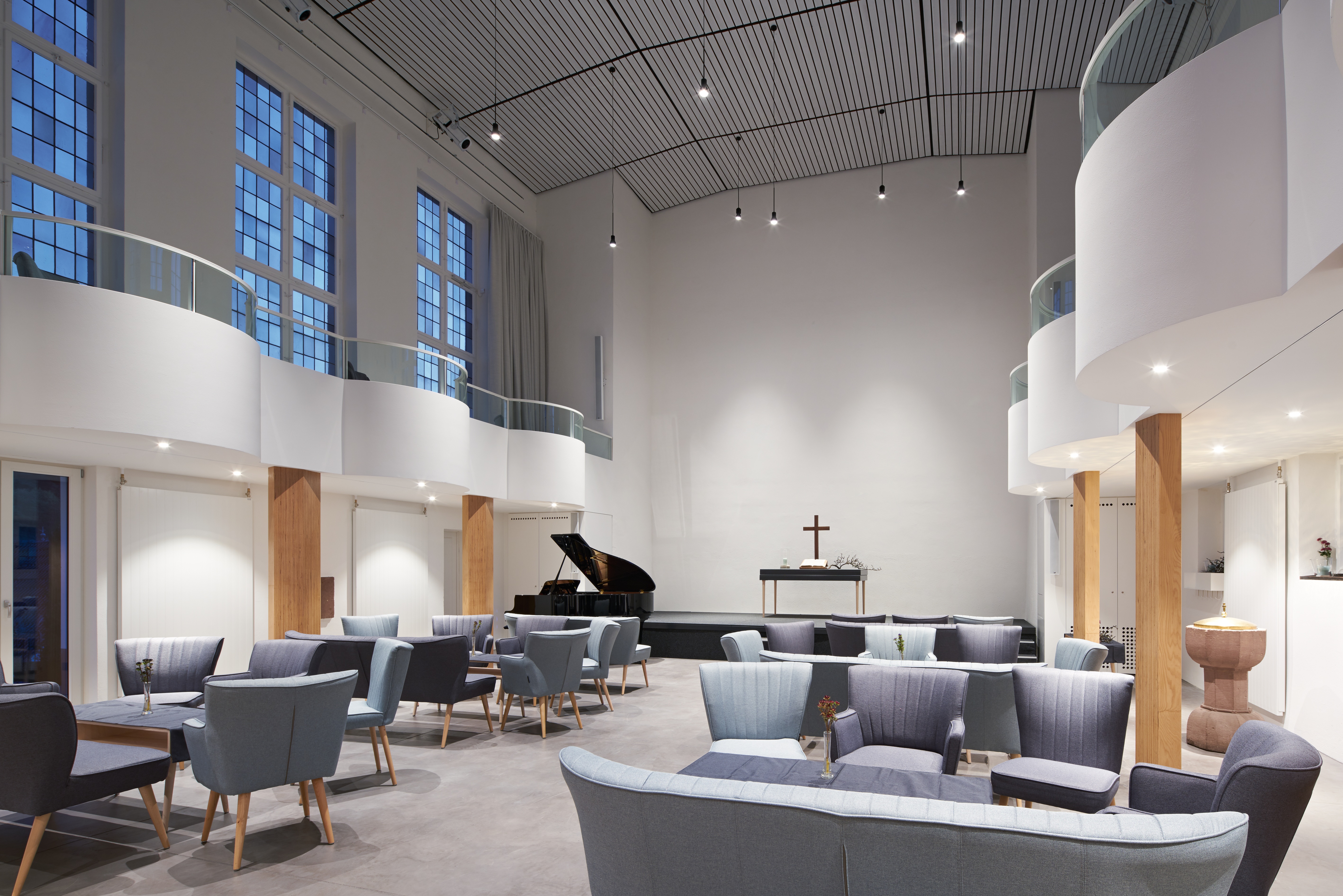 Den Kindergottesdienstraum und ein Kirchencafé in den bestehenden Sakralraum zu integrieren, stellt flächenmäßig den größten Teil des neuen Raumprogramms dar. Im rückwärtigen Teil der Kirche wird hierfür ein Bereich ausgebildet, der beide Nutzungen aufnehmen kann. Die Lage dieses Bereiches gibt dem Raum einerseits, bei geschlossenen Türen, eine eigene Orientierung durch die drei bodentiefen Fenster. Andererseits wird die Längsachse der Kirche hierdurch bei offenen Türen betont und der Sakralraum optisch verlängert. Als Kirchencafé oder als Vorraum bei Konzerten wird durch die Öffnung der Querachse eine Verknüpfung mit dem Vorplatz und dem Kirchengarten ermöglicht.