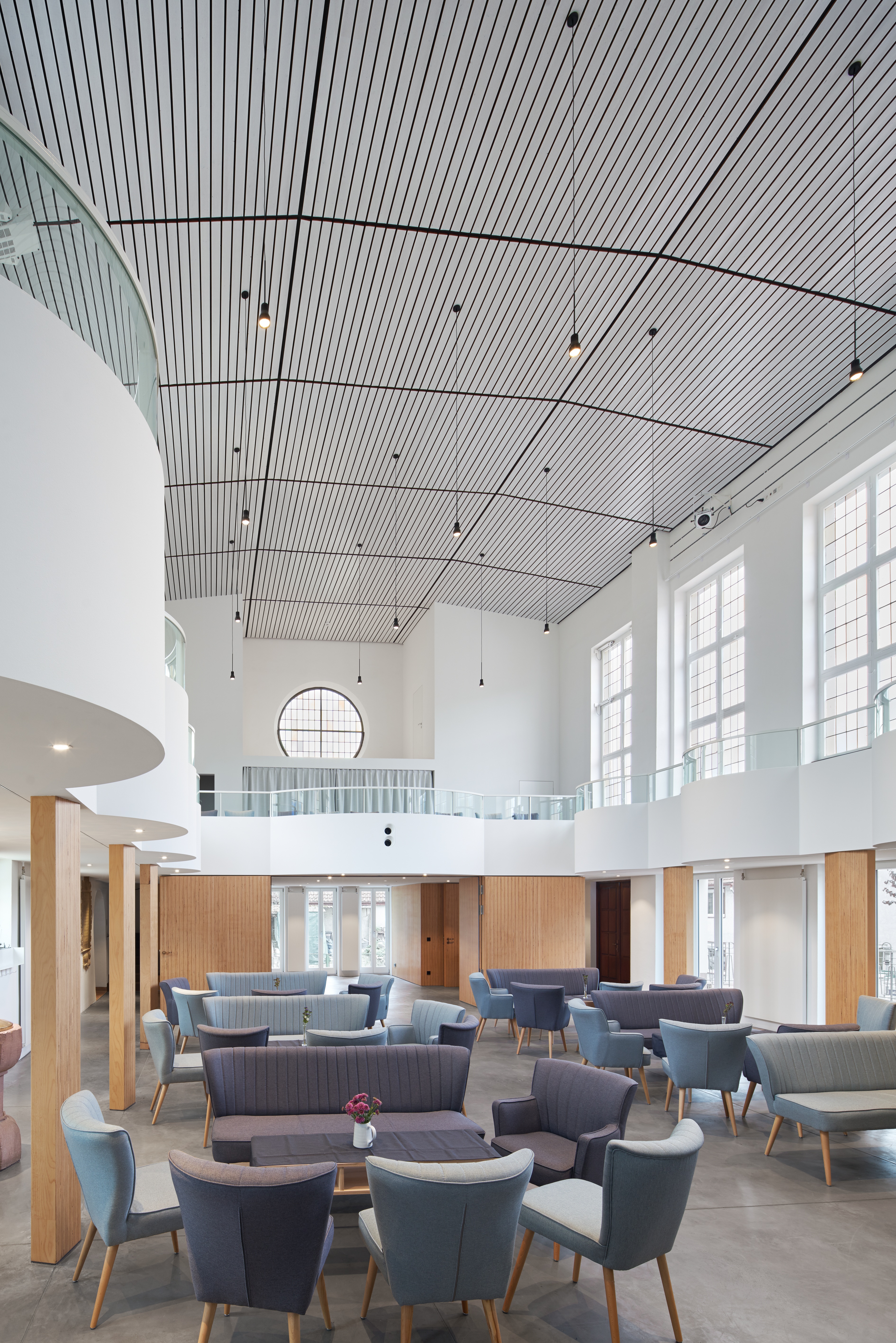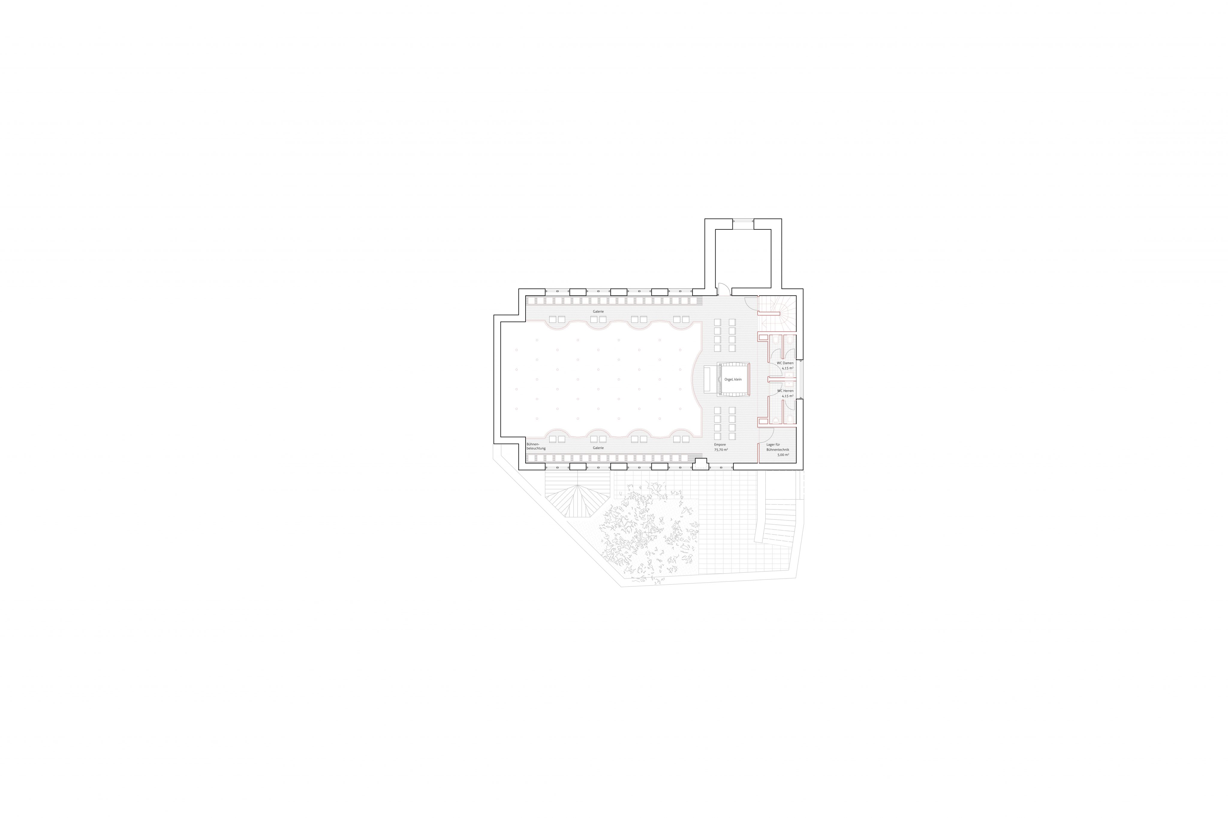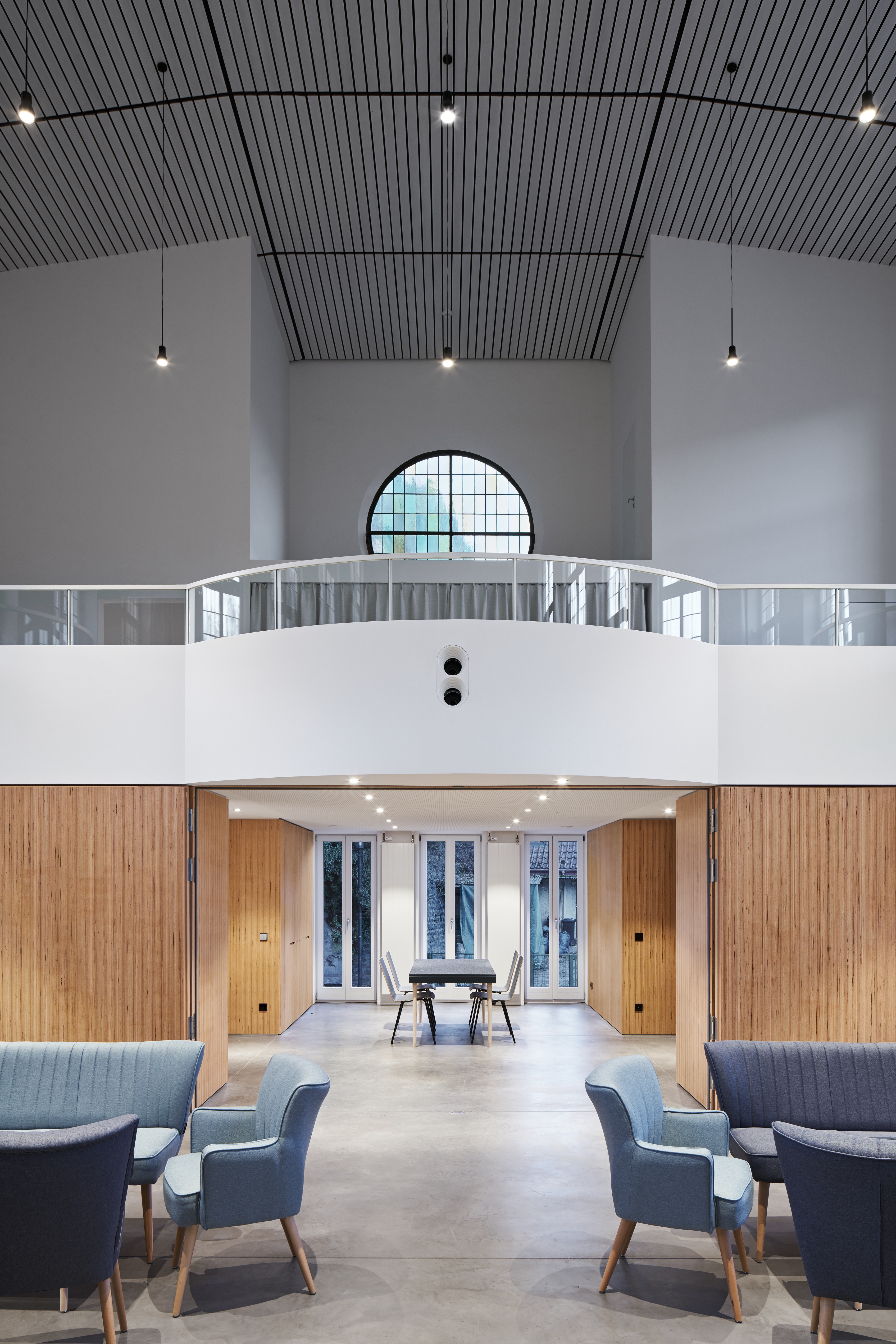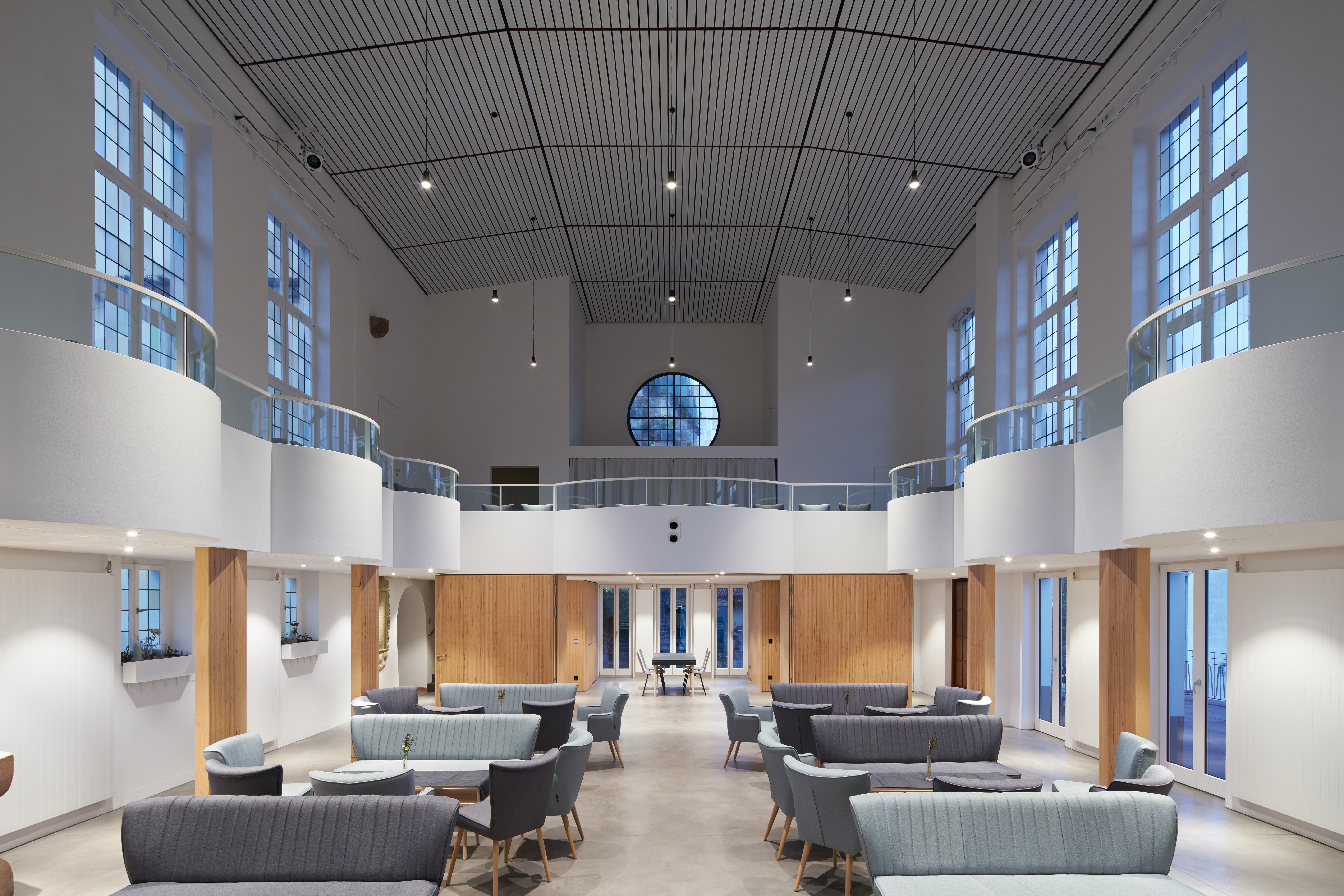 Den Kindergottesdienstraum und ein Kirchencafé in den bestehenden Sakralraum zu integrieren, stellt flächenmäßig den größten Teil des neuen Raumprogramms dar. Im rückwärtigen Teil der Kirche wird hierfür ein Bereich ausgebildet, der beide Nutzungen aufnehmen kann. Die Lage dieses Bereiches gibt dem Raum einerseits, bei geschlossenen Türen, eine eigene Orientierung durch die drei bodentiefen Fenster. Andererseits wird die Längsachse der Kirche hierdurch bei offenen Türen betont und der Sakralraum optisch verlängert. Als Kirchencafé oder als Vorraum bei Konzerten wird durch die Öffnung der Querachse eine Verknüpfung mit dem Vorplatz und dem Kirchengarten ermöglicht.