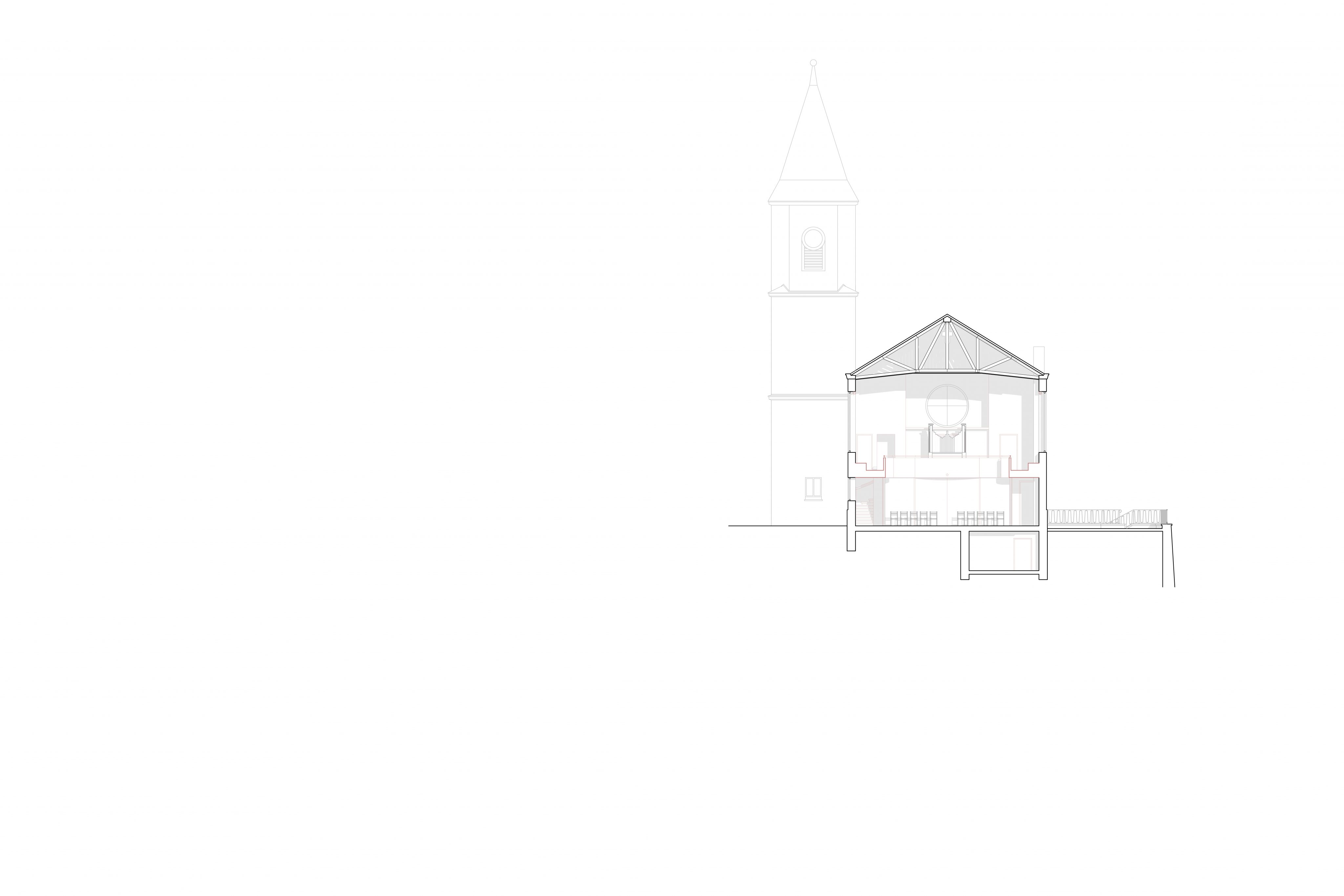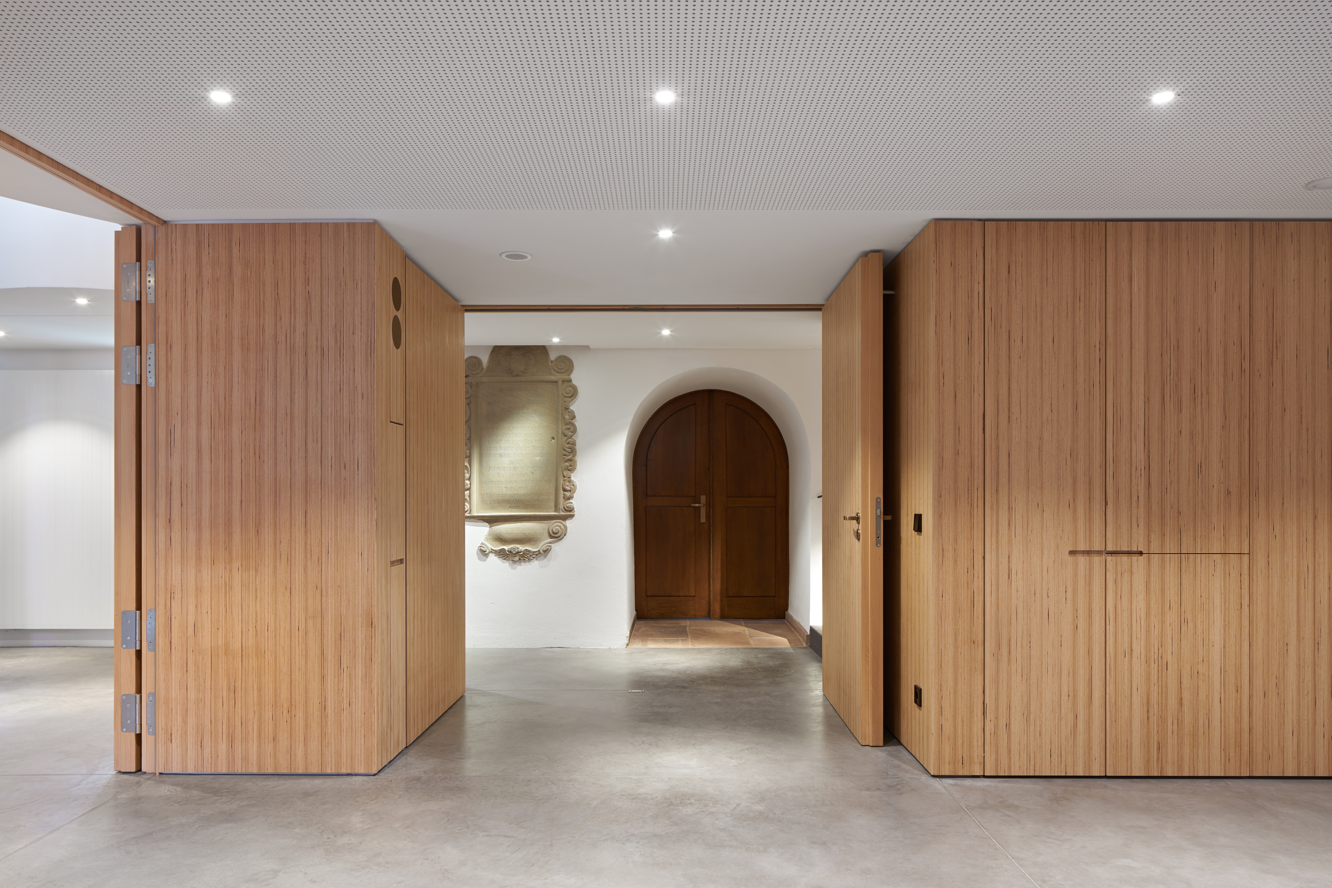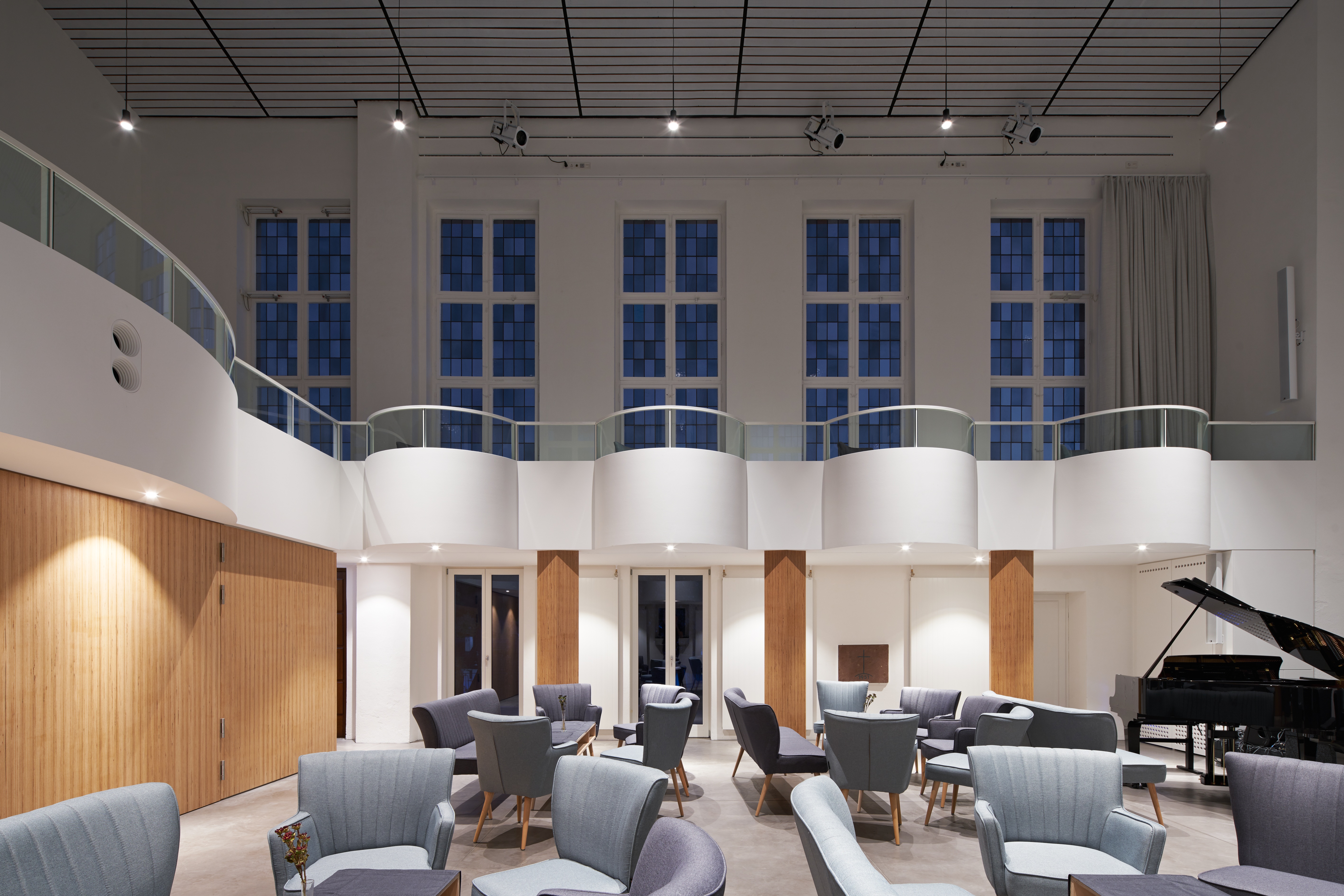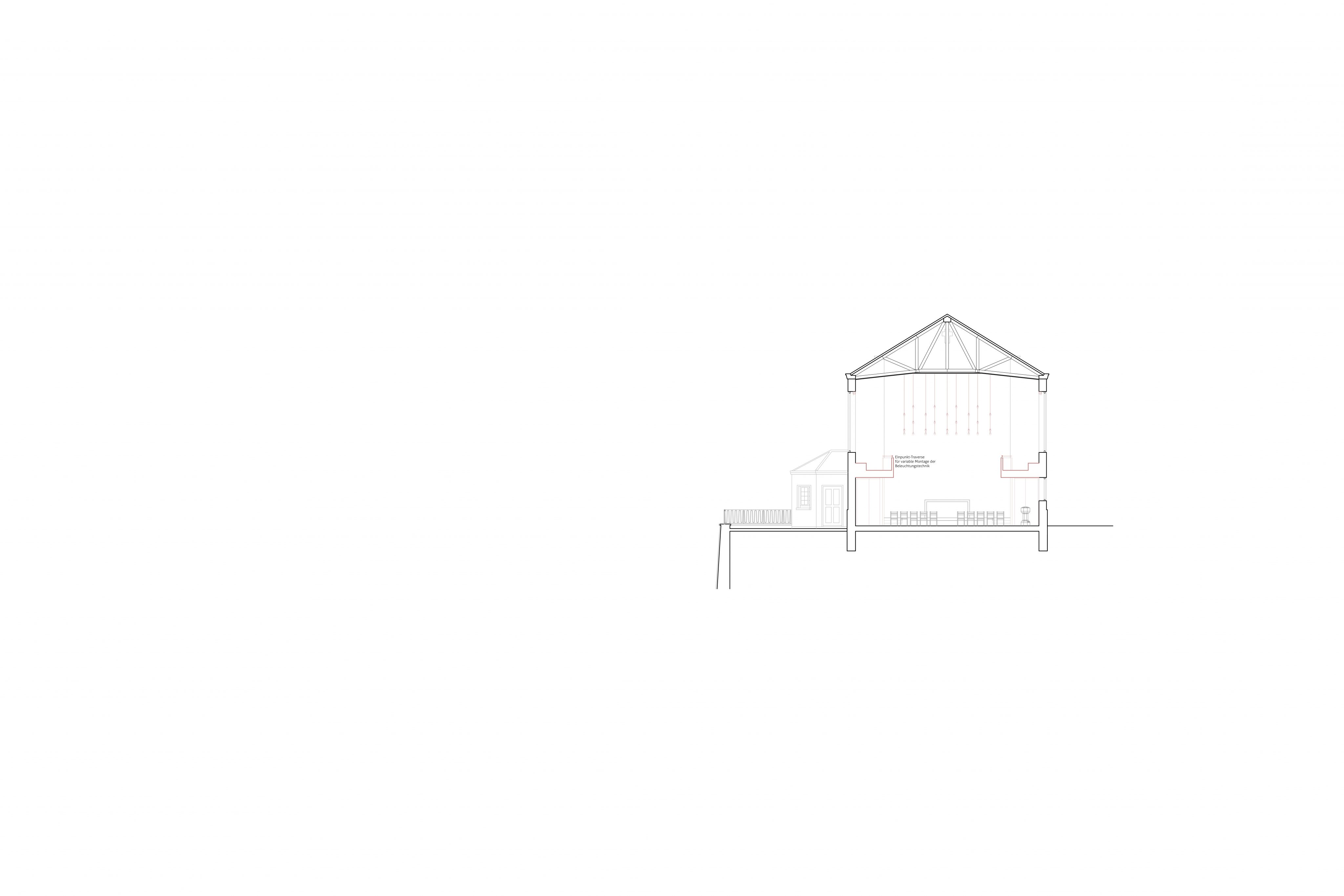 Den Kindergottesdienstraum und ein Kirchencafé in den bestehenden Sakralraum zu integrieren, stellt flächenmäßig den größten Teil des neuen Raumprogramms dar. Im rückwärtigen Teil der Kirche wird hierfür ein Bereich ausgebildet, der beide Nutzungen aufnehmen kann. Die Lage dieses Bereiches gibt dem Raum einerseits, bei geschlossenen Türen, eine eigene Orientierung durch die drei bodentiefen Fenster. Andererseits wird die Längsachse der Kirche hierdurch bei offenen Türen betont und der Sakralraum optisch verlängert. Als Kirchencafé oder als Vorraum bei Konzerten wird durch die Öffnung der Querachse eine Verknüpfung mit dem Vorplatz und dem Kirchengarten ermöglicht.