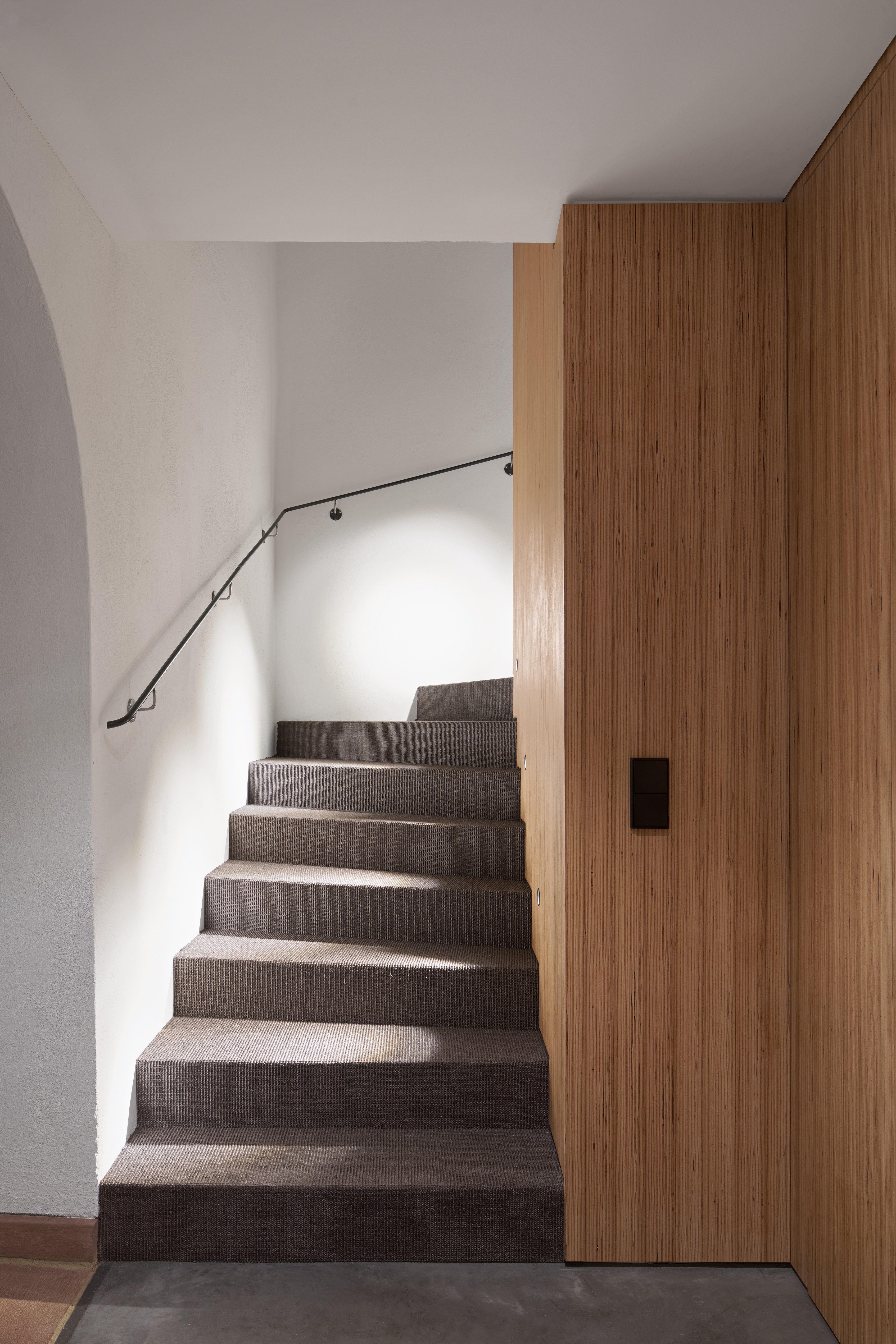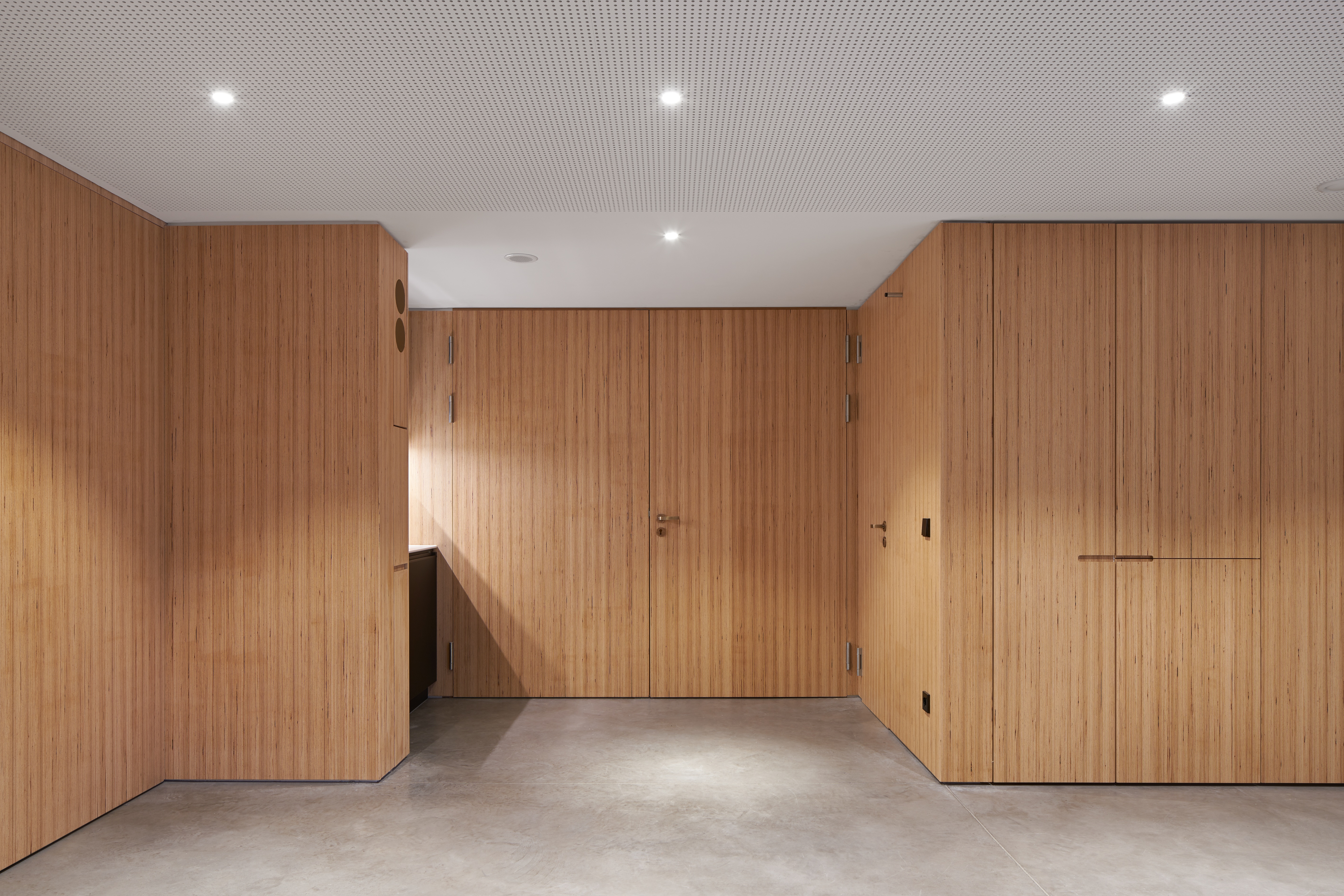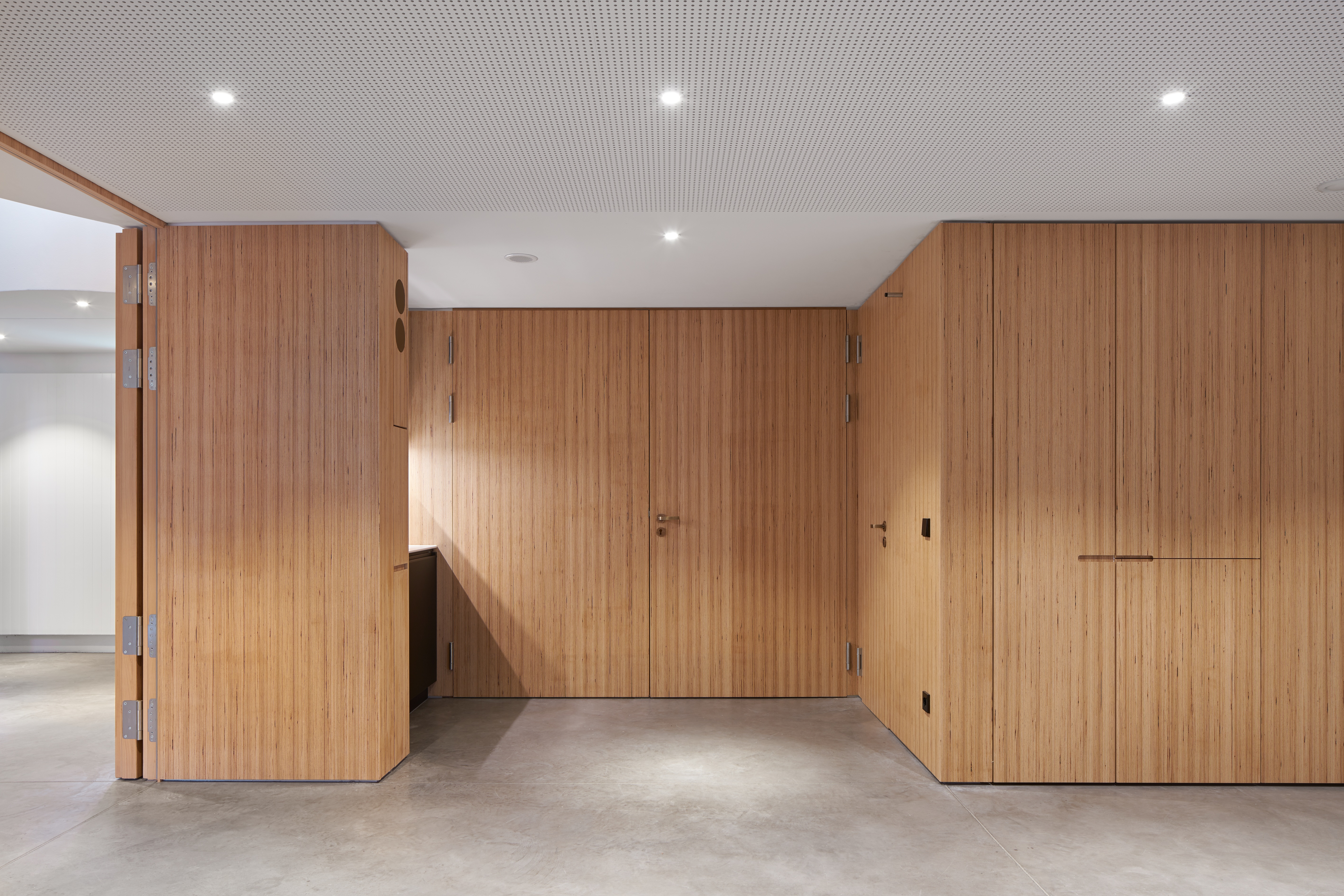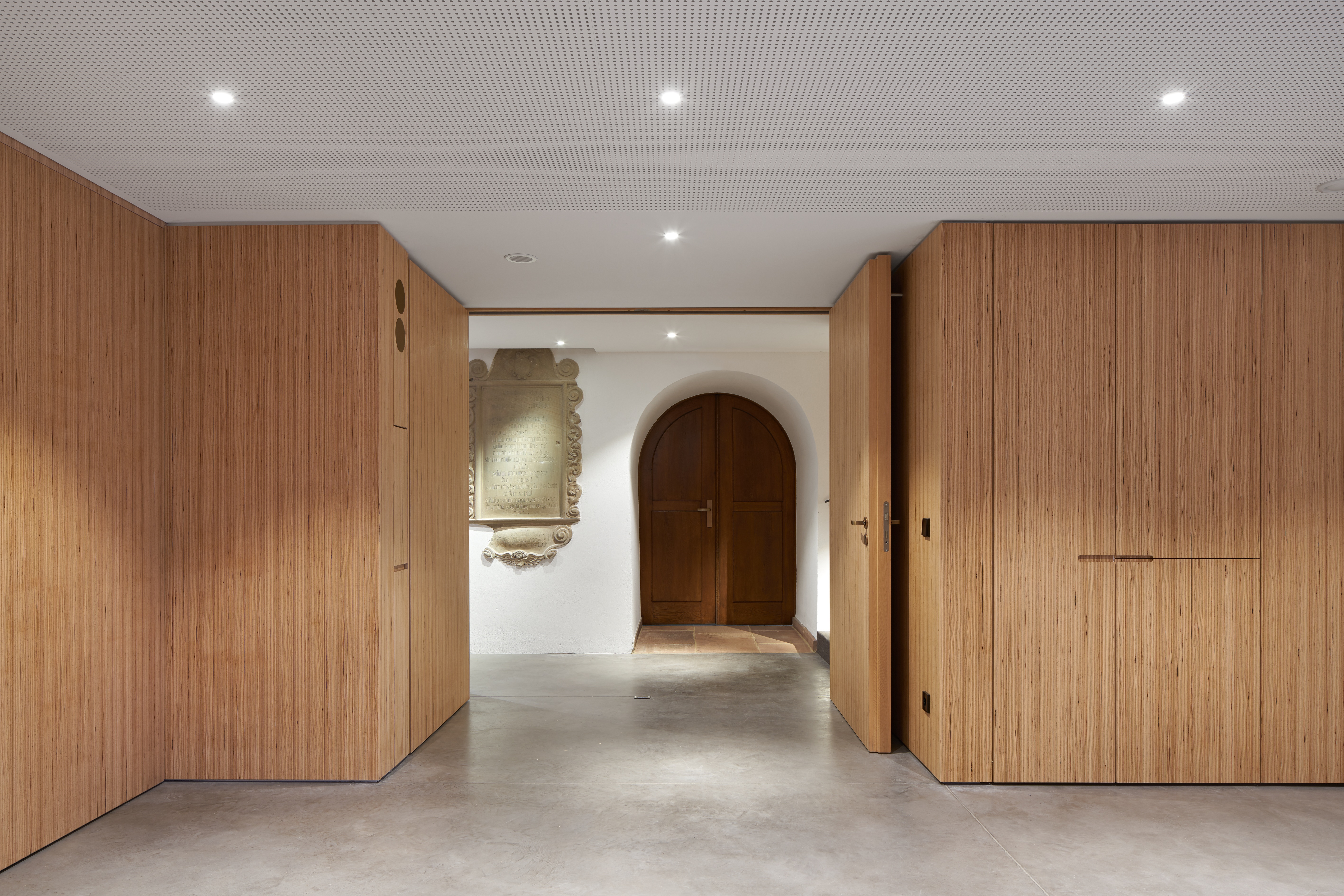 Den Kindergottesdienstraum und ein Kirchencafé in den bestehenden Sakralraum zu integrieren, stellt flächenmäßig den größten Teil des neuen Raumprogramms dar. Im rückwärtigen Teil der Kirche wird hierfür ein Bereich ausgebildet, der beide Nutzungen aufnehmen kann. Die Lage dieses Bereiches gibt dem Raum einerseits, bei geschlossenen Türen, eine eigene Orientierung durch die drei bodentiefen Fenster. Andererseits wird die Längsachse der Kirche hierdurch bei offenen Türen betont und der Sakralraum optisch verlängert. Als Kirchencafé oder als Vorraum bei Konzerten wird durch die Öffnung der Querachse eine Verknüpfung mit dem Vorplatz und dem Kirchengarten ermöglicht.