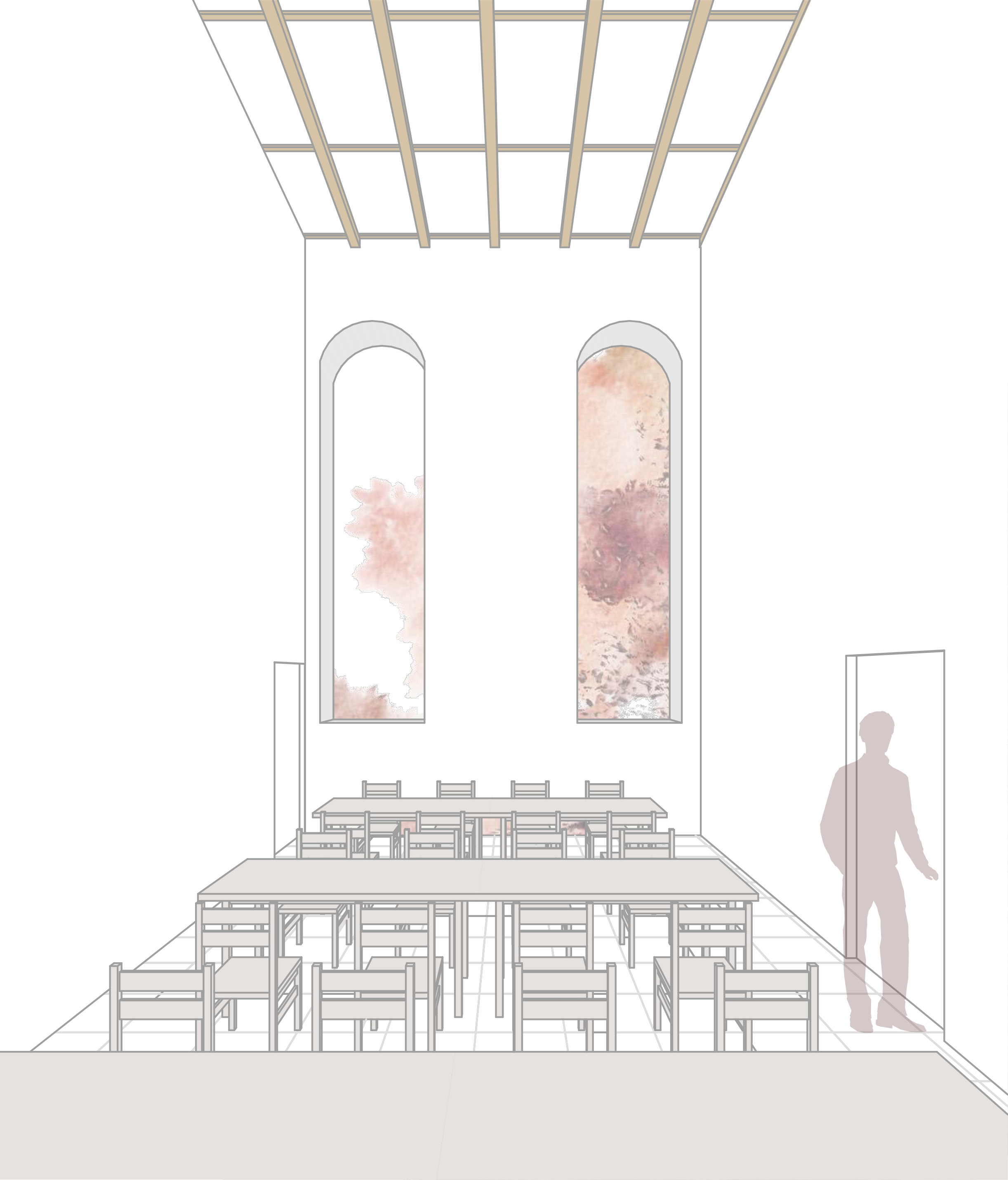 Um verschiedene Nutzungsmöglichkeiten anbieten zu können, bildet ein großer Kirchenraum, der bei Bedarf in drei Räume geteilt werden kann, die Grundlage. Zudem soll ein weiterer Raum, der große Gemeindesaal, ausgebildet werden.