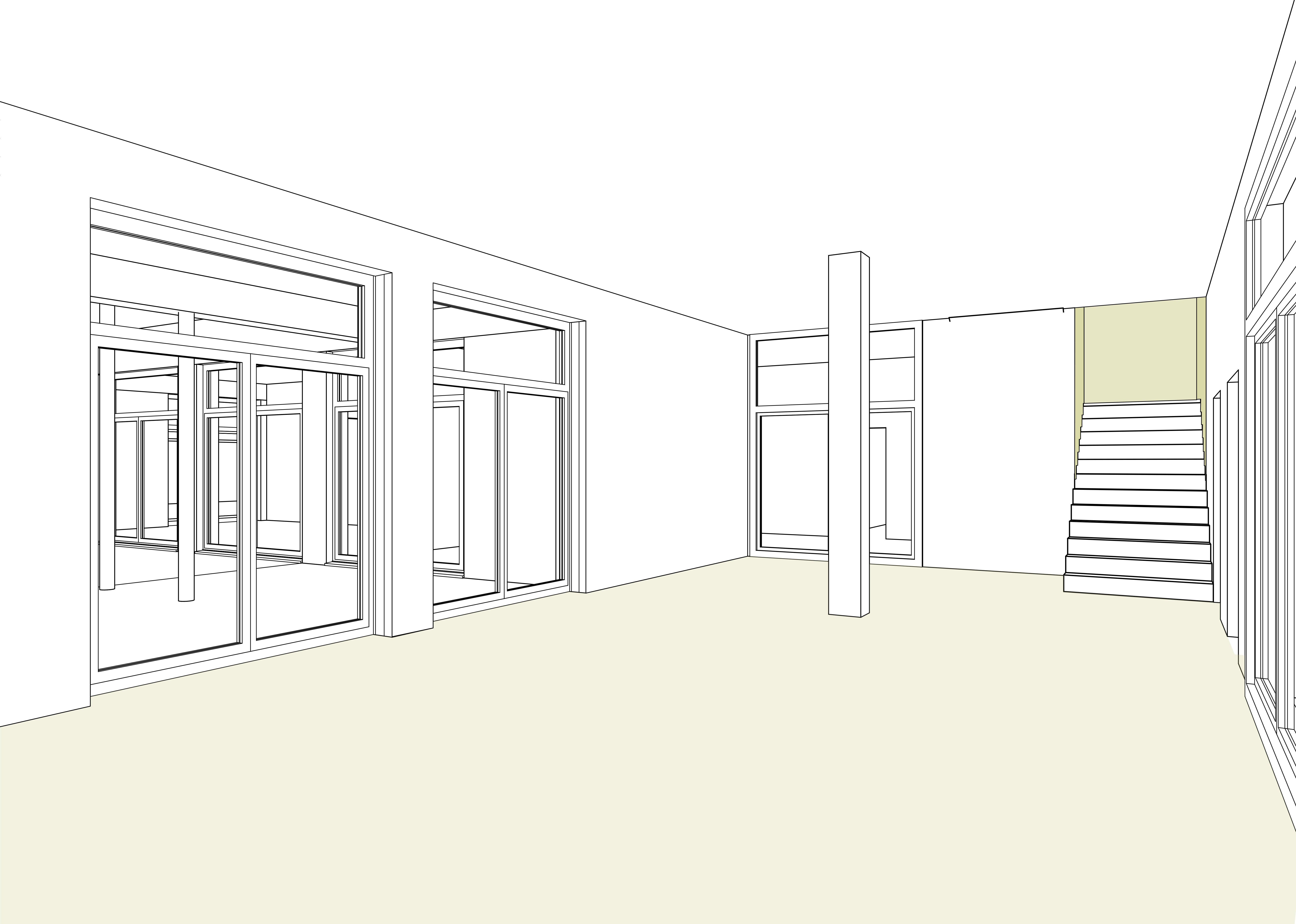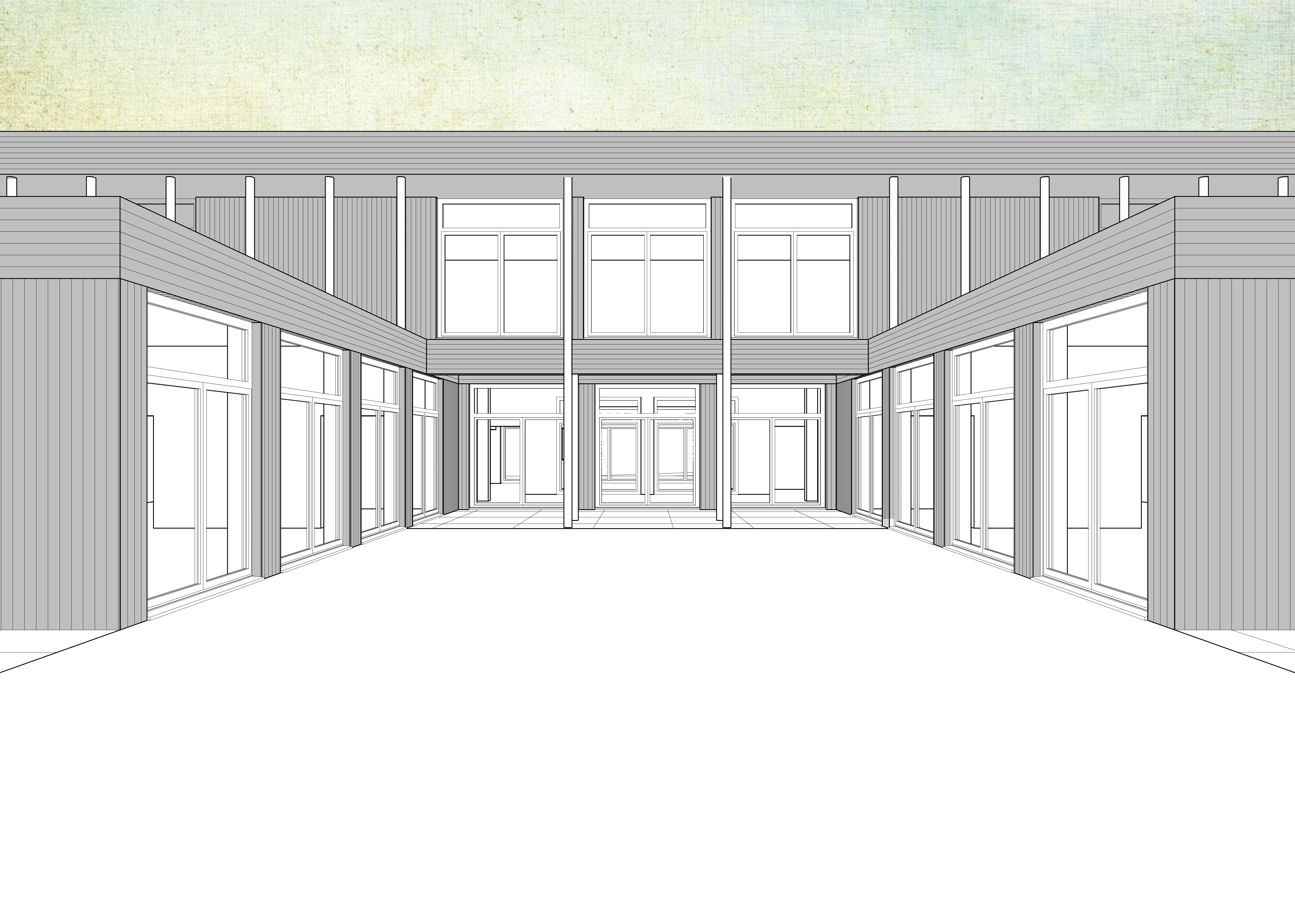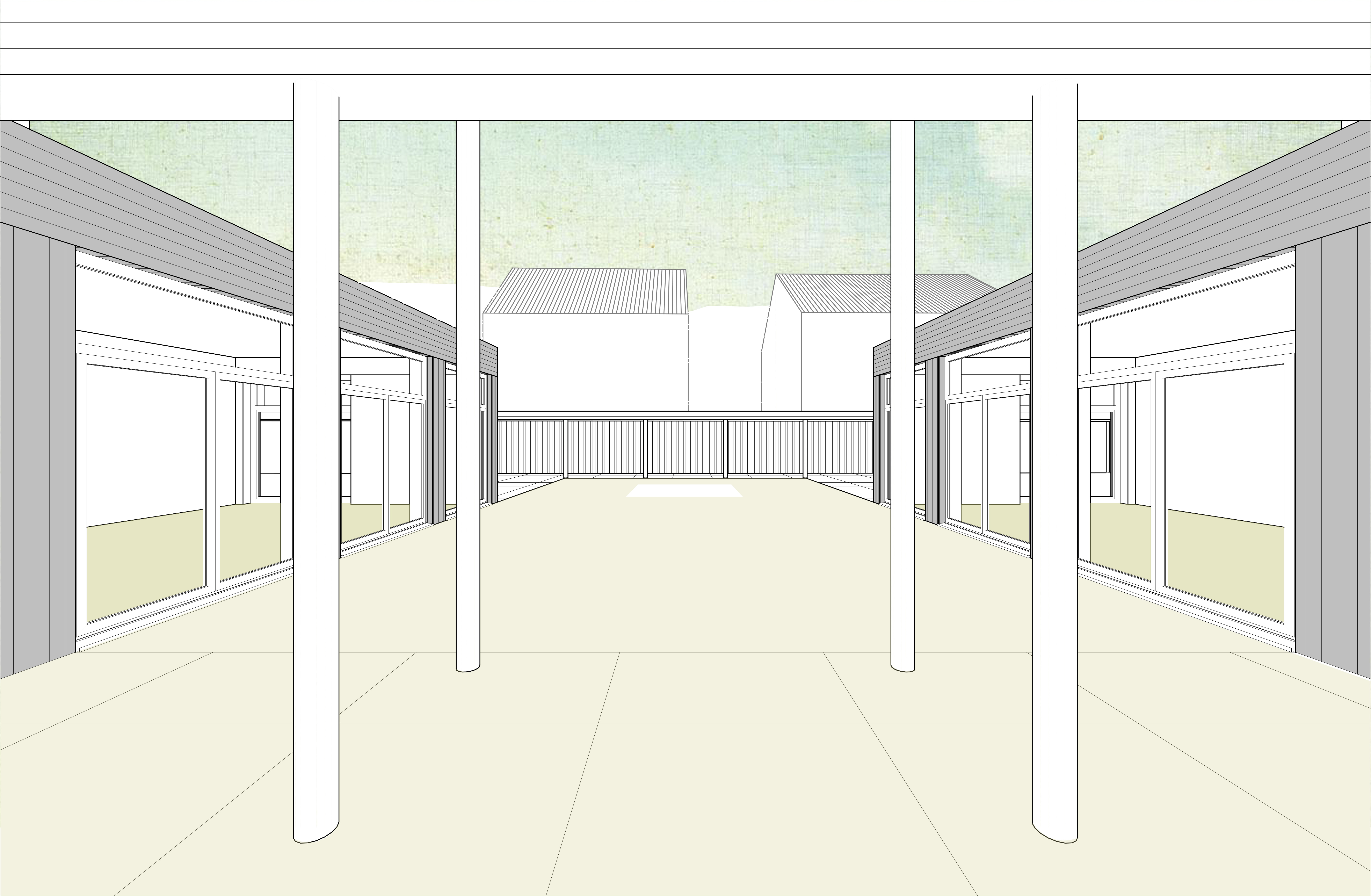 Dem Kindergarten vorgelagert ist ein großzügiger Vorplatz, der als Ankunftsbereich dient. Das Gebäude empfängt den Nutzer im Schutze eines großzügigen Vordaches.