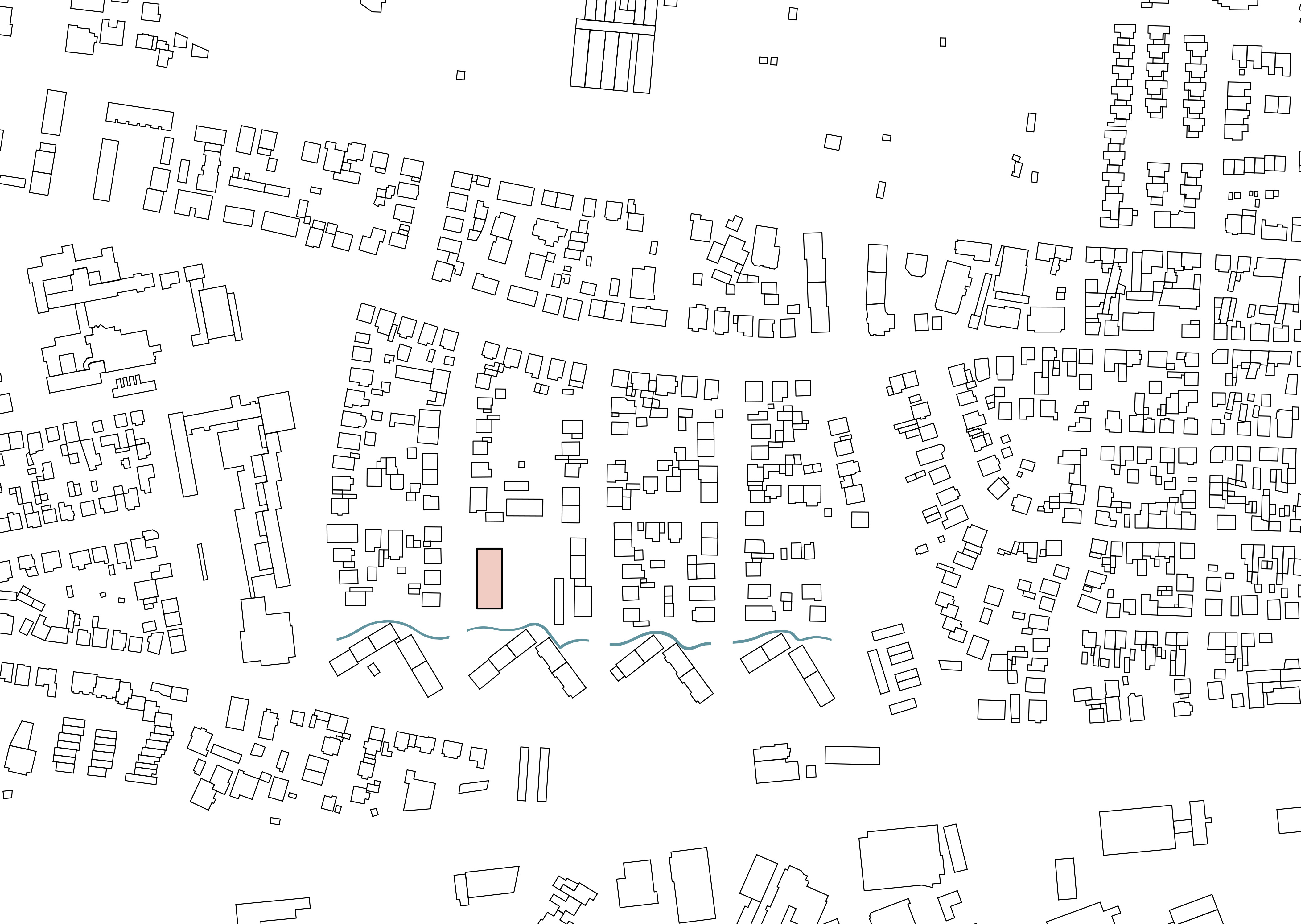 Der Baukörper führt als Riegel auf dem westlichen Grundstücksrand die Baulinie fort, gibt dem Garten eine räumliche Grenze und schirmt Lärm von der Straßenseite ab.