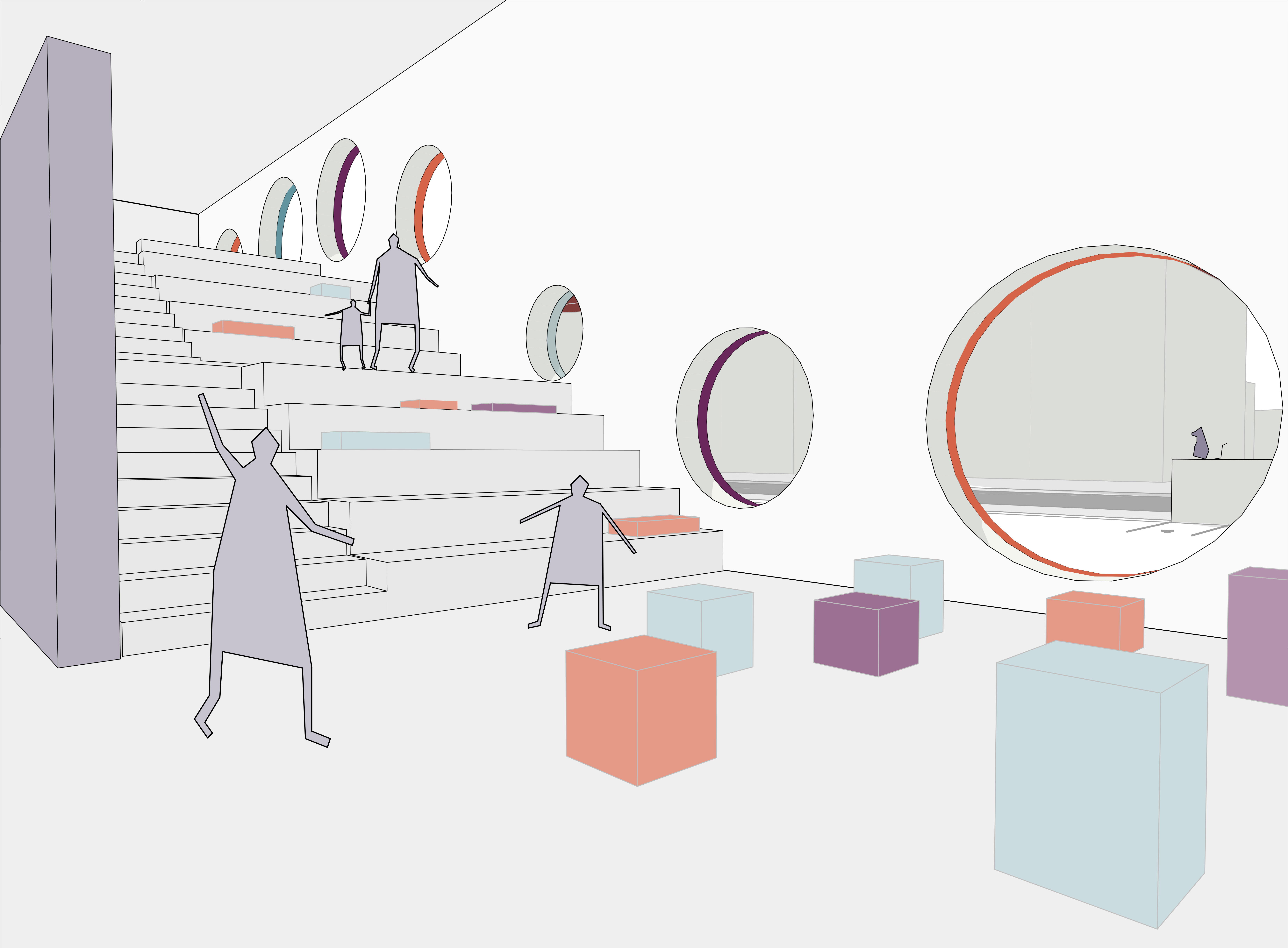 Große runde Öffnungen definieren den Bereich der Spieltreppe und nehmen so Bezug ins Quartier auf. Die Fassade der Ostseite ist geprägt von großen, raumhohen Fensteröffnungen, die Blickbeziehungen zum Gartenbereich ermöglichen.
